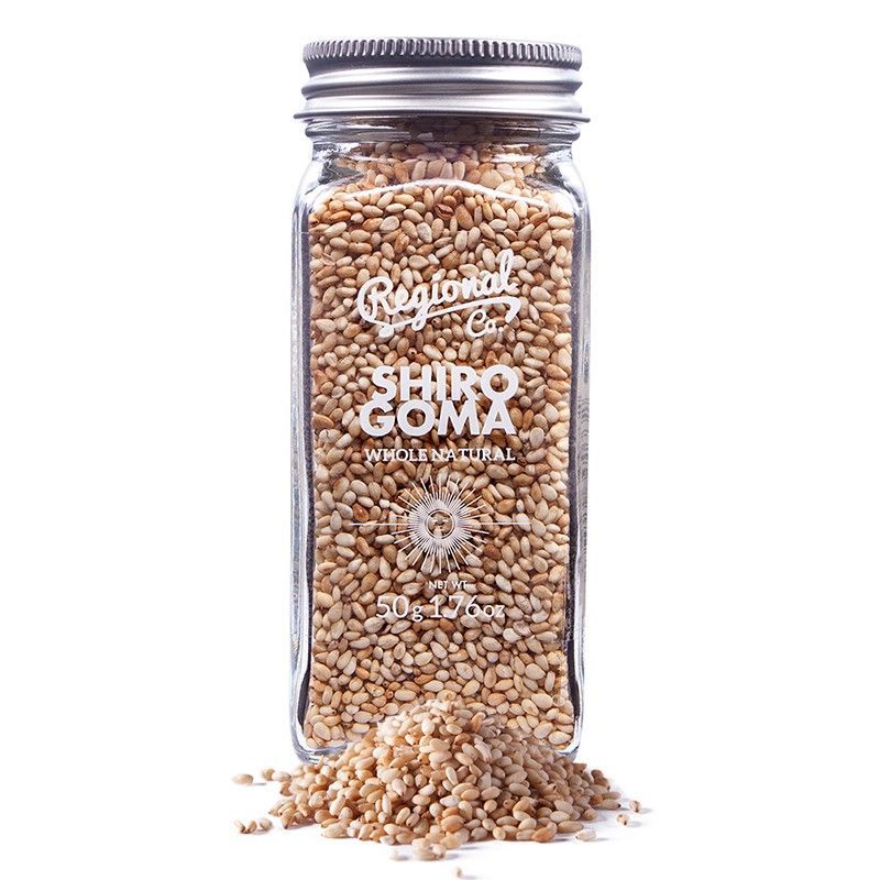 Shirogoma, semillas de ajonjoli blancas 100% naturales de Regional Co. Ideal para cocinar, saltear, tostar o añadir a ensaladas y salsas. En frasco de vidrio transparente con tapa metálica, fácil de usar y conservar. Perfecto para amantes de la cocina japonesa y saludable.