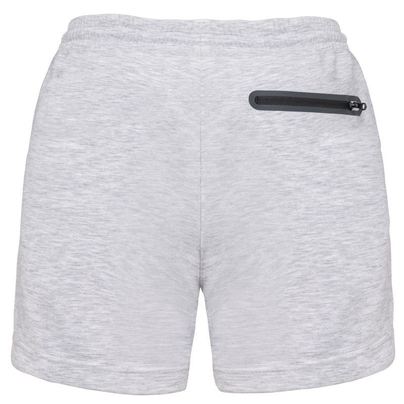 Short de mujer en tejido mezcla de poliéster y algodón, ideal para el día a día o entrenamientos ligeros. Cintura elástica para mayor comodidad y bolsillo trasero con cremallera negra para guardar pequeños objetos. Diseño sencillo y funcional en tono gris claro, perfecto para combinar con cualquier outfit casual o deportivo.