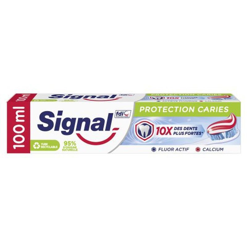 Pasta de dientes Signal Fam. 100 Anticaries con flúor activo y calcio, en caja de 100 ml. Protección contra caries y dientes hasta 10 veces más fuertes. Fórmula con 95% ingredientes naturales. Ideal para toda la familia que busca una higiene bucal efectiva y cuidado dental diario.