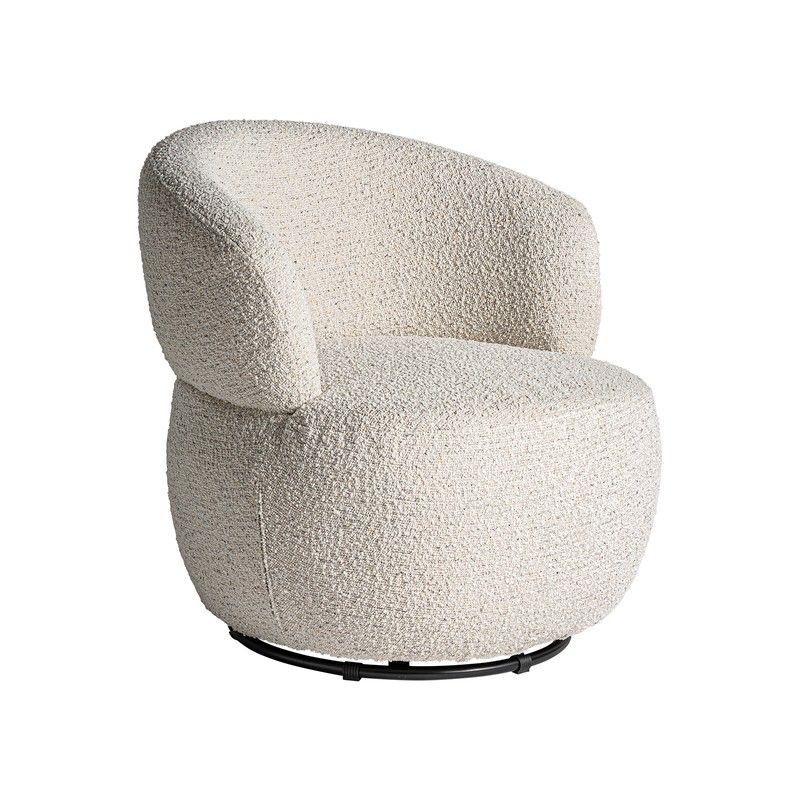 Sillón giratorio Vayres en tejido bouclé blanco, con diseño redondeado y base metálica negra que permite rotación. Ideal para salones, rincones de lectura o espacios de descanso. Su tapicería suave y acogedora aporta comodidad y estilo moderno a cualquier ambiente. Dimensiones: 73 x 71 x 72 cm.
