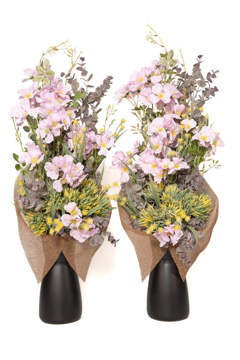 Ramo de flores artificiales silvestres en tonos rosa y amarillo, ideal para decorar cementerios o espacios con estilo rústico. Confeccionado con materiales sintéticos de alta calidad y envuelto en lona marrón, se presenta sobre un soporte negro elegante. Resistente, duradero y fácil de mantener, perfecto para homenajes permanentes o decoración hoga