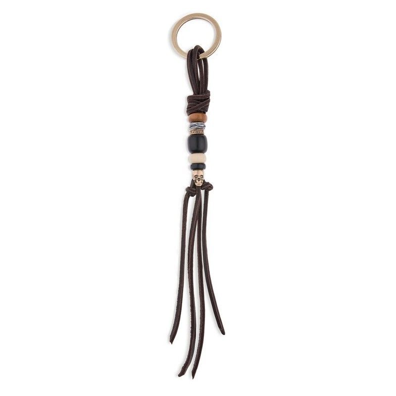 Llavero SK003X con diseño de calavera en metal y cuerda de cuero marrón trenzada. Ideal para adultos que buscan un accesorio con estilo bohemio y detalles étnicos. Incluye perlas decorativas y flecos que le dan un toque sofisticado y único. Perfecto para llaves, bolsos o mochilas.