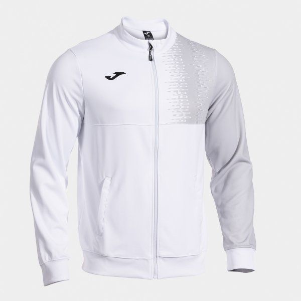 Chaqueta deportiva Smash Full Zip Sweatshirt en blanco y gris, ideal para entrenamientos y uso diario. Confeccionada en poliéster de alta calidad, presenta cierre completo, cuello alto y detalles en contraste. Diseño moderno con textura geométrica en el pecho y logo de Joma. Perfecta para deportistas y amantes del estilo activo.