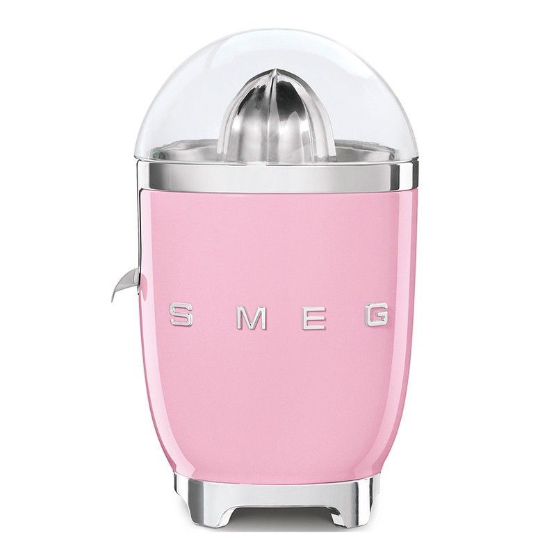 Exprimidor SMEG de diseño retro en color rosa, fabricado en aluminio y tritan de alta calidad. Ideal para amantes de la cocina con estilo, este exprimidor combina funcionalidad y elegancia. Perfecto para preparar jugos frescos en casa con un toque vintage. Incluye tapa transparente y base metálica cromada para un uso seguro y fácil limpieza.