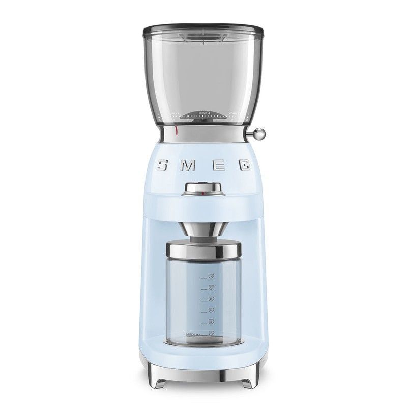 Molinillo de café SMEG en elegante color azul celeste, con diseño retro y acabados en acero inoxidable. Ideal para amantes del café que buscan calidad y estilo en su cocina. Incluye depósito transparente para granos y recipiente graduado para el café molido. Perfecto como regalo para cualquier ocasión.