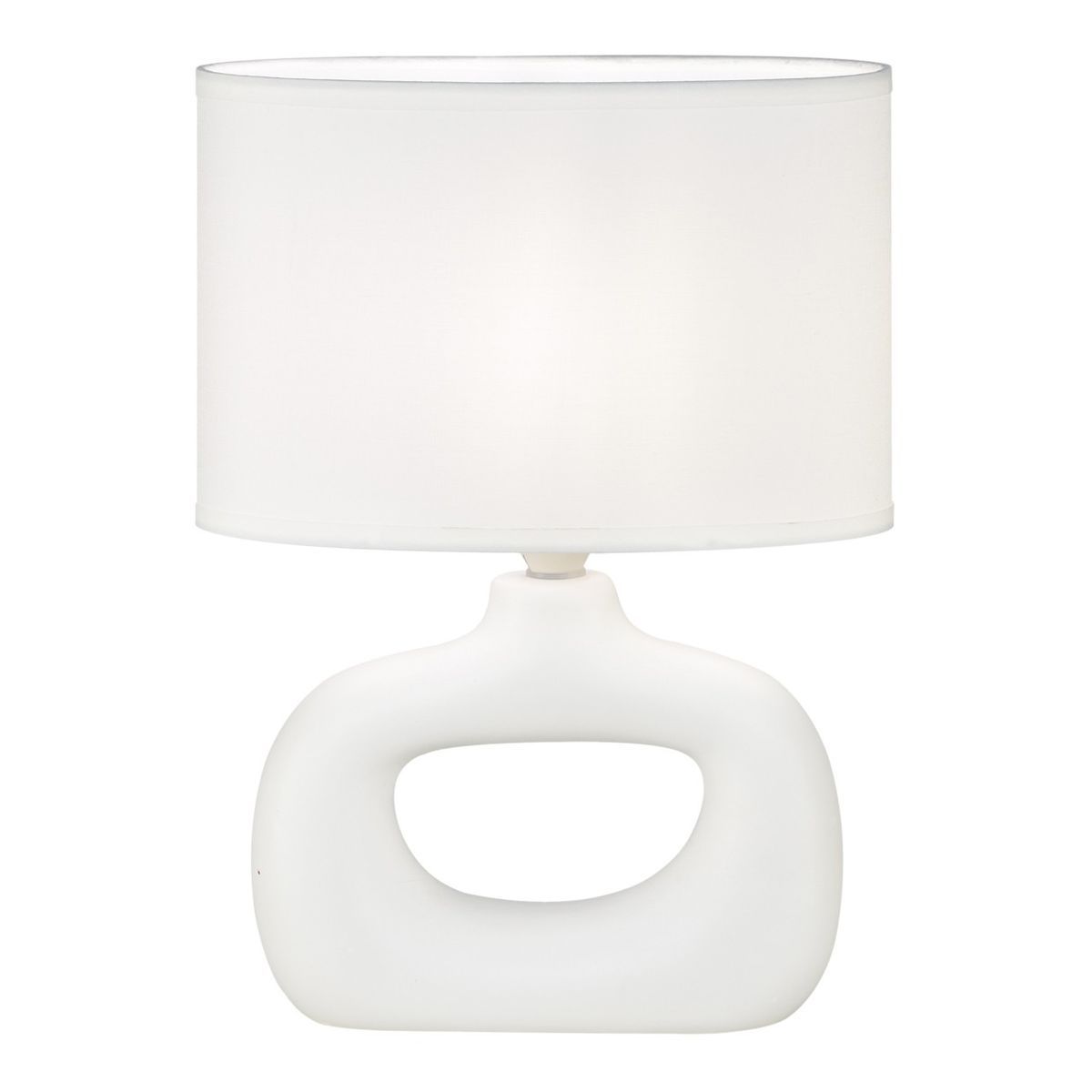 Lámpara sobremesa Dalton en blanco, con base de cerámica y pantalla de textil. Diseño moderno y minimalista con hueco central en la base, ideal para decorar mesitas de noche, escritorios o rincones de lectura. Aporta luz cálida y estilo contemporáneo a cualquier espacio. Compatible con bombilla E14 de hasta 40W.