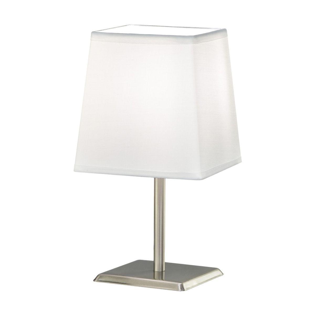Lámpara de sobremesa Fox con acabado en níquel satinado y pantalla de tela blanca. Diseño elegante y minimalista, perfecta para mesitas de noche, escritorios o rincones de lectura. Fabricada con materiales de calidad para una iluminación cálida y sofisticada en cualquier ambiente. Incluye base cuadrada estable y estructura cilíndrica que combina fu