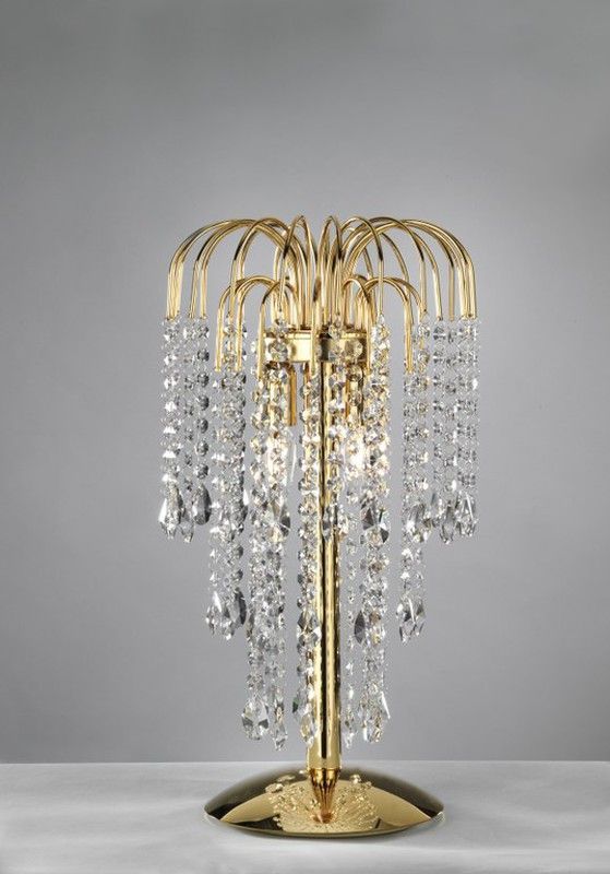 Lámpara sobremesa Serie Pioggia Onli con estructura metálica dorada y cristales facetados que caen en cascada, creando un efecto luminoso elegante y sofisticado. Ideal para decorar mesas de comedor, salones o espacios de recepción. Combina diseño clásico con un toque moderno, perfecta para ambientes de lujo y estilo.