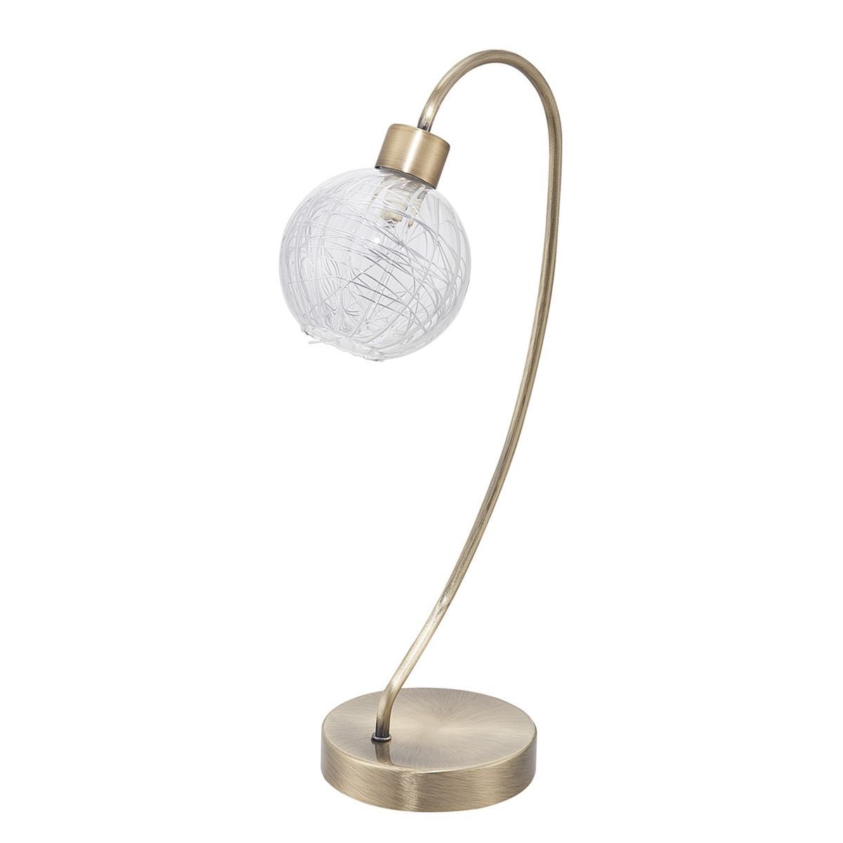 Lámpara de sobremesa con diseño elegante y moderno, ideal para decorar mesas de noche, escritorios o mesitas de centro. Fabricada en metal dorado y vidrio transparente con efecto de hilos internos, aporta un toque sofisticado a cualquier espacio. Perfecta para ambientes con estilo industrial o escandinavo.