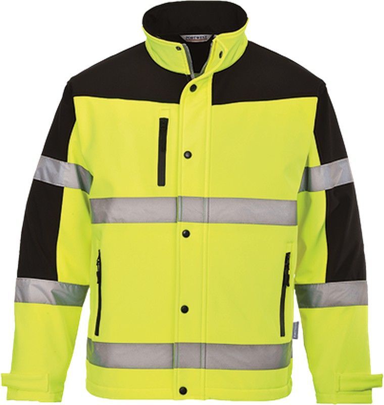 Chaqueta softshell bicolor de alta visibilidad, ideal para trabajos en exteriores o zonas de tráfico. Confeccionada en poliéster resistente, presenta paneles en amarillo fluorescente y negro con bandas reflectantes plateadas para mayor seguridad. Cierre con botones, bolsillos con cremallera y puños ajustables. Diseño funcional y cómodo para adultos