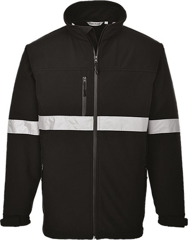 Chaqueta softshell IONA de tres capas, ideal para trabajos en exteriores o climas fríos. Confeccionada en poliéster y textil, ofrece protección y comodidad. Incluye bandas reflectantes blancas en pecho y brazos para mayor visibilidad. Cierre completo, bolsillos con cremallera y puños elásticos. Diseño funcional y resistente para adultos.