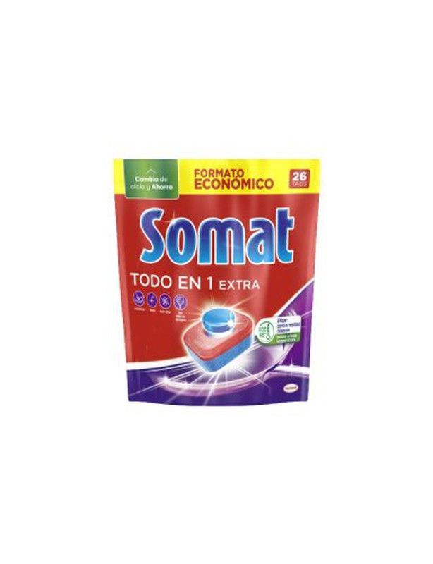 Somat Todo en 1 Extra Pastillas para lavavajillas, formato económico con 26 pastillas para una limpieza perfecta.