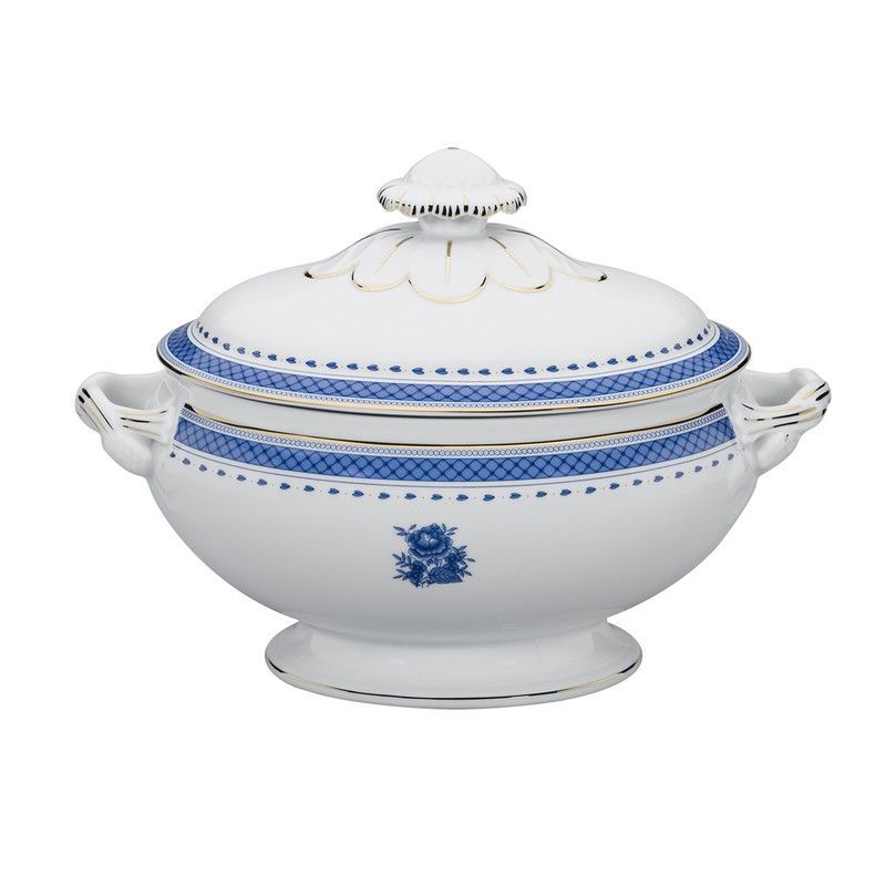 Sopera de porcelana blanca con detalles azules y acabados plateados, ideal para servir sopa o guisos con estilo clásico. Diseño elegante con bordes decorativos y asas laterales, perfecta para comidas formales o diarias. Fabricada en porcelana de alta calidad, resistente y fácil de limpiar. Aporta un toque sofisticado a tu mesa.