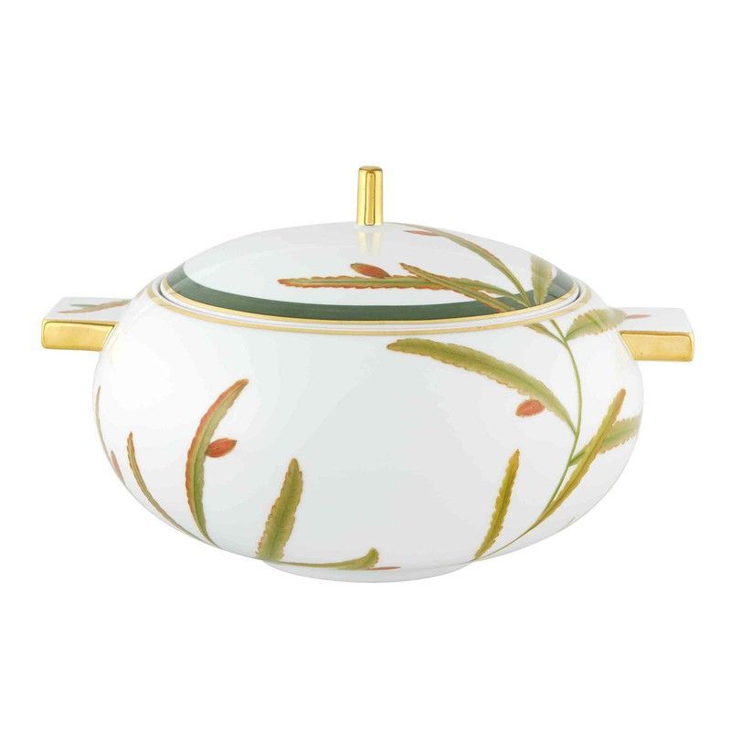 Sopera de porcelana Amazónia con diseño de hoja verde y detalles en dorado y naranja. Ideal para servir sopas y guisos con estilo en tu mesa. Su acabado elegante y calidad premium la convierten en un accesorio sofisticado para cualquier ocasión. Con asas y tapa doradas, combina funcionalidad y diseño.