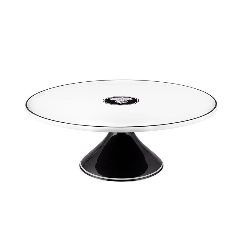 Soporte para tartas de porcelana en blanco, con base negra y diseño elegante. Ideal para presentar pasteles, postres o dulces en cualquier ocasión. Su acabado brillante y forma circular lo convierten en un accesorio sofisticado para tu mesa. Dimensiones: Ø 36 x 13,9 cm. Perfecto para eventos especiales o uso diario en cocina y comedor.