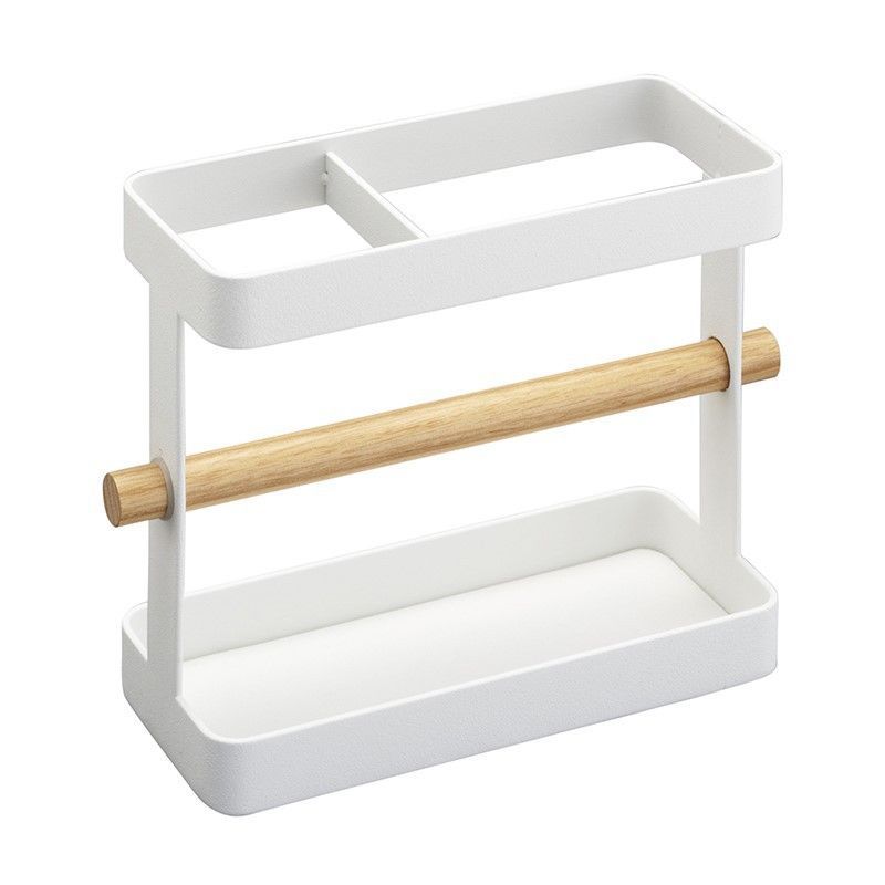 Soporte para utensilios de cocina en blanco y madera natural, ideal para mantener tu encimera organizada. Con diseño funcional de dos niveles, incluye barra central para colgar cucharas, tenedores y espátulas, y compartimentos para almacenar accesorios. Fabricado en plástico resistente y madera natural, perfecto para cocinas modernas y minimalistas