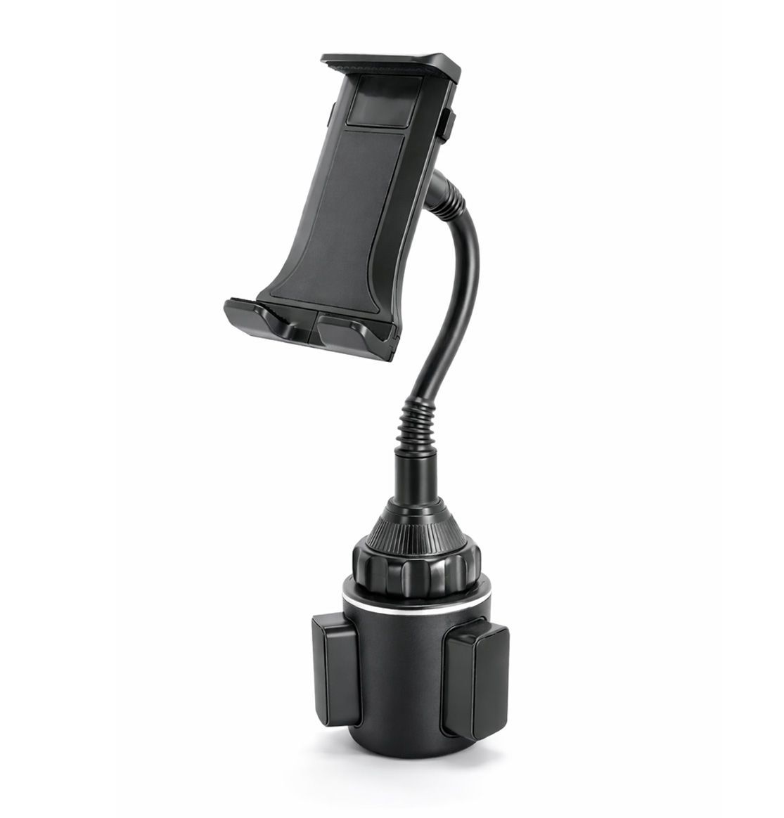 Soporte para teléfono con pinza y brazo articulado, diseñado para colocarse en el posavasos del coche. Fabricado en plástico y goma, permite una fijación segura y ajuste en múltiples ángulos. Ideal para conductores que necesitan tener su móvil a mano durante el viaje. Fácil instalación y compatibilidad con la mayoría de teléfonos móviles.