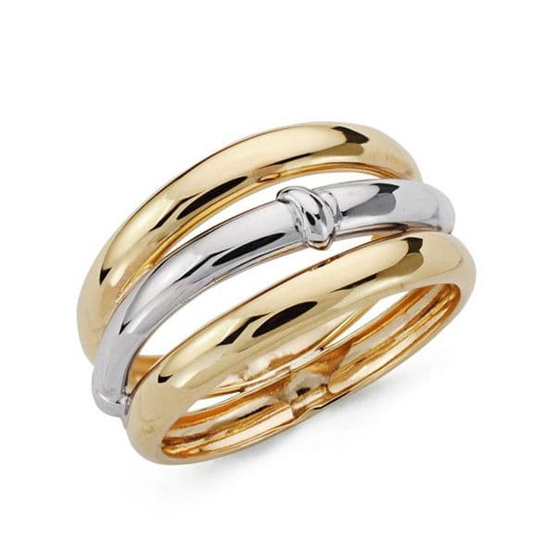 Sortija bicolor en oro 9k y plata, con tres bandas entrelazadas que combinan elegancia y modernidad. Ideal para adultos que buscan un accesorio sofisticado y versátil. Fabricada con metales preciosos de alta calidad, perfecta para usar diariamente o como pieza destacada en ocasiones especiales. Su diseño pulido y brillante resalta la belleza del or