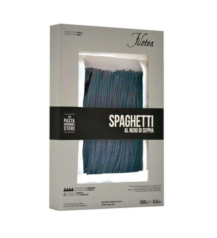 Spaghetti al nero di seppia de Filotea, 250 g, en elegante caja de cartón con ventana transparente. Pasta italiana de alta calidad con color negro intenso gracias al tinta de sepia. Ideal para amantes de la cocina gourmet y platos con sabor distintivo. Perfecto para preparar recetas sofisticadas con un toque marino y visual impactante.
