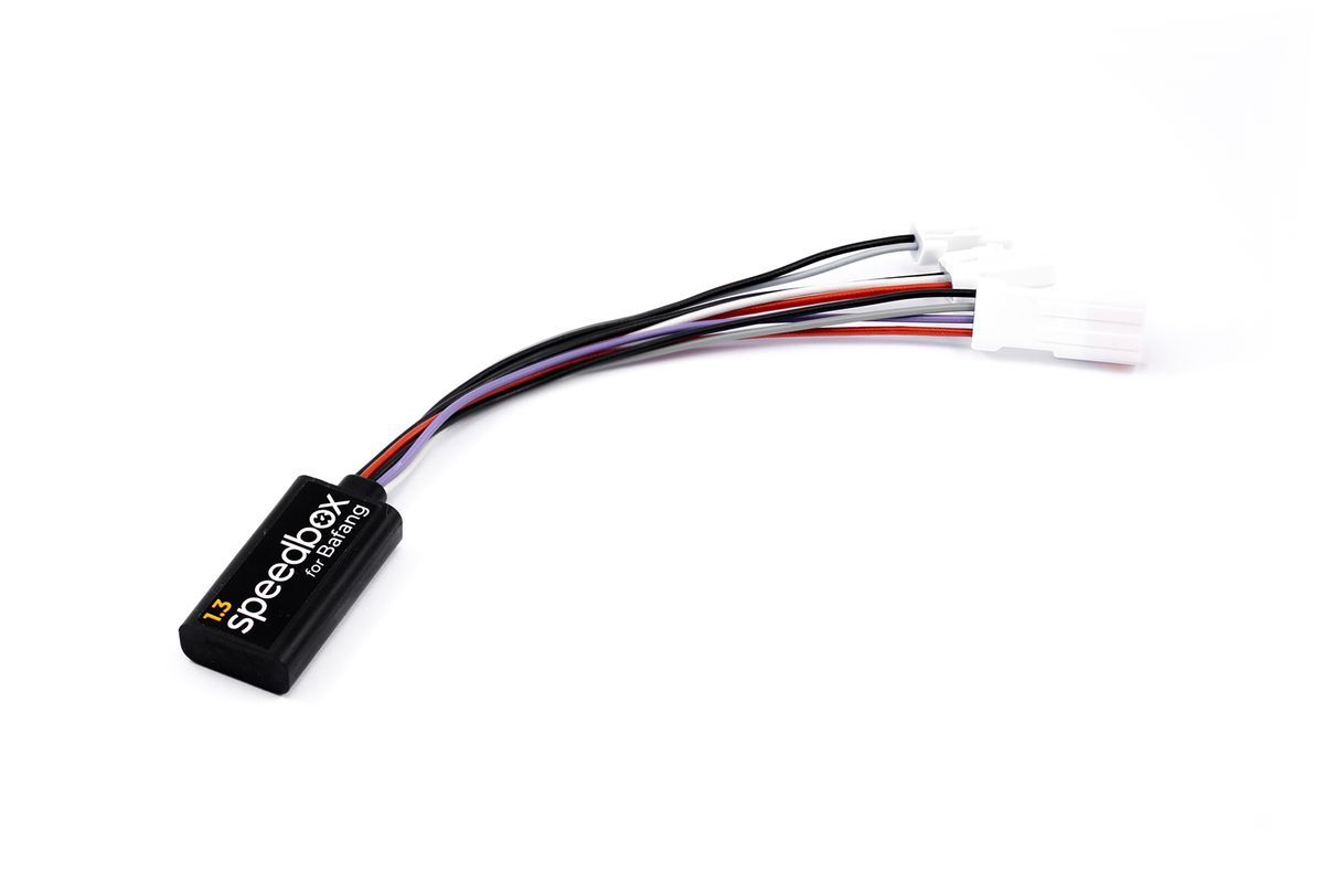 SpeedBox 1.3 para Bafang, módulo electrónico compacto y resistente en plástico, diseñado para mejorar el rendimiento de bicicletas eléctricas con motor Bafang. Incluye conector de 4 pines con cables codificados por color para una instalación sencilla y precisa. Ideal para ciclistas que buscan optimizar su sistema de asistencia sin modificar el moto