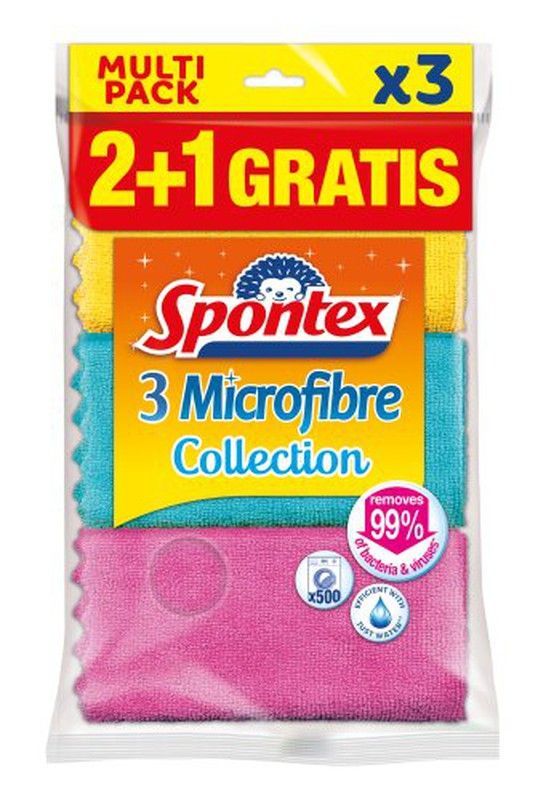 Pack de 3 bayetas microfibra Spontex en colores amarillo, azul y rosa. Ideal para limpiar superficies en casa, cocina y baño. Elimina hasta el 99% de bacterias y virus con solo agua. Resistente hasta 500 lavados. Oferta 2+1 gratis. Calidad profesional, suave y absorbente. Perfecta para uso diario en hogar y cocina.