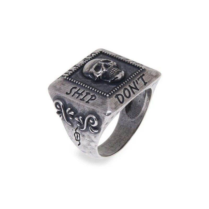 Anillo unisex de plata de ley 925 con diseño de calavera y inscripción 'SHIP DON'T', ideal para amantes del estilo punk, biker o rock. Con acabado antiguo y detalles tallados, este anillo destaca por su calidad y diseño atrevido. Perfecto para usar diariamente o como pieza de declaración.