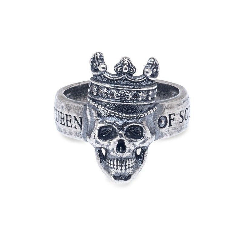 Anillo SR009A de plata de ley 925 con diseño de calavera coronada, ideal para amantes del estilo gótico y rock. Con inscripción 'QUEEN OF SOUL' y acabado antiguo, destaca por su calidad y detalles en relieve. Perfecto para lucir con looks atrevidos y expresar personalidad única.