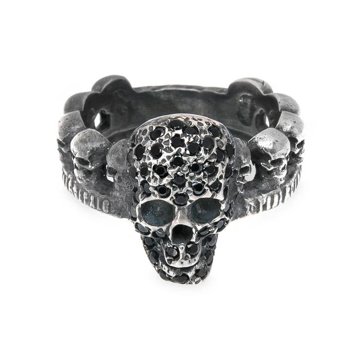 Anillo unisex con diseño de calaveras en relieveCalavera central pavimentada con circonitas negrasBanda con detalles de calaveras lateralesEstilo gótico y punkAcabado mate con brillo en los detalles