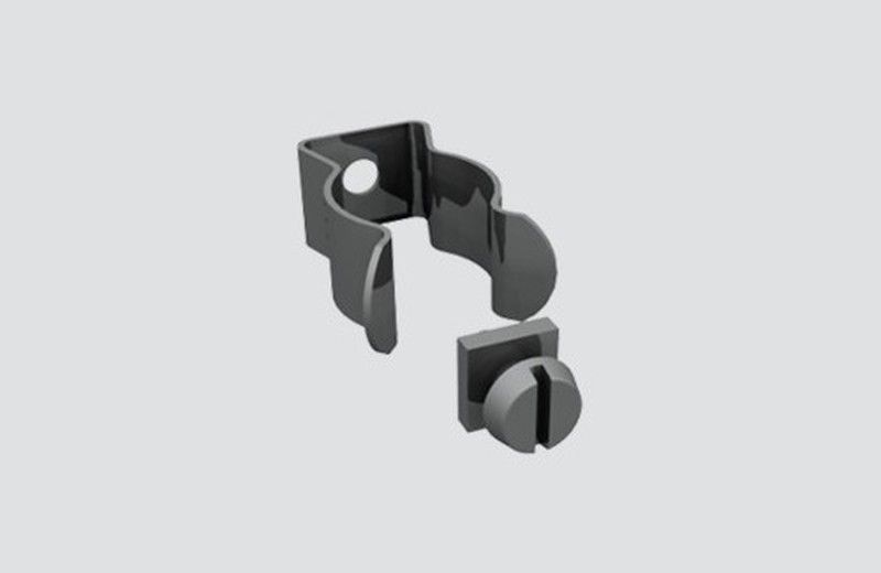 Soporte metálico gris para lámparas T5 de la marca Stucchi, ideal para instalaciones de iluminación fija en pared. Fabricado en metal resistente, cuenta con diseño funcional con orificio para montaje y tornillo de ajuste. Perfecto para aplicaciones en hogar, jardín o espacios comerciales que requieran una fijación segura y duradera.