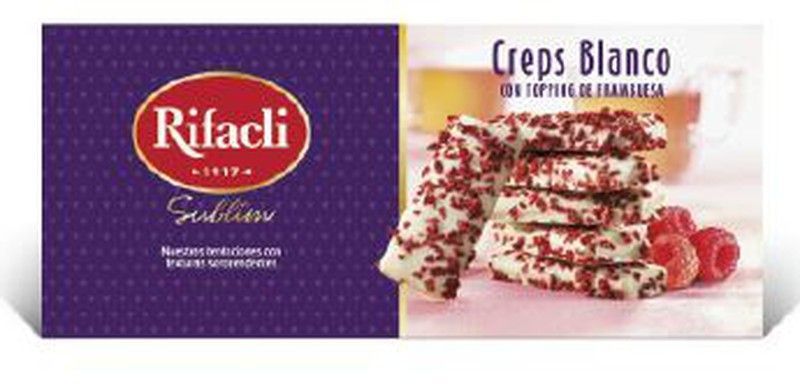 Deliciosos creps blancos con topping de frambuesa de la marca Rifacli, presentados en una elegante caja rectangular. Perfectos para disfrutar como snack dulce o postre, con un toque de fruta natural. Ideal para amantes de los productos gourmet y de calidad. Peso neto: 90 gramos.