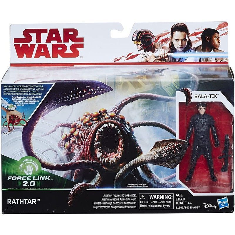 Juguete Star Wars con figura de acción de Bala-Tik y criatura Rathar, ideal para niños de 4 años en adelante. Incluye tecnología Force Link 2.0 para activar sonidos. Embalaje con ventana transparente que muestra los detalles del set. Perfecto para fans de la saga y coleccionistas de figuras de acción.