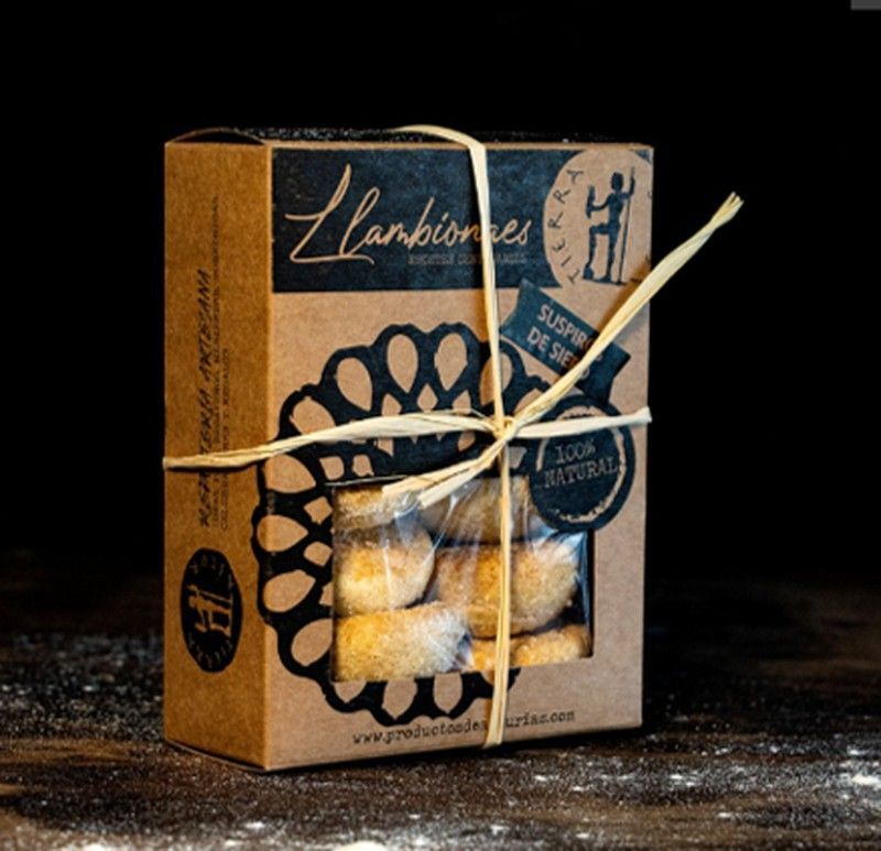 Suspiros de Siero Tierra Astur, deliciosos dulces artesanales elaborados con ingredientes naturales, presentados en una elegante caja de cartón con ventana transparente. Perfectos para regalar o disfrutar como tentempié gourmet. 100% naturales, sin conservantes, ideales para amantes de la pastelería tradicional asturiana.
