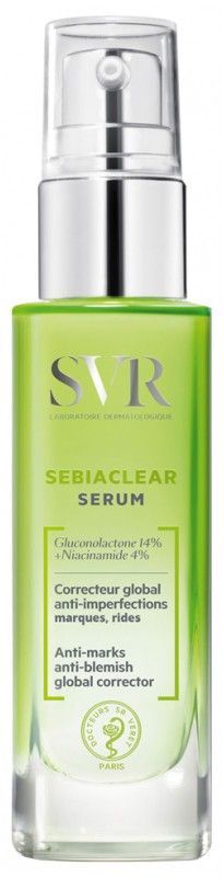 SVR Sebiaclear Sérum 30ml: sérum dermatológico con Gluconolactona 14% y Niacinamida 4% para corregir imperfecciones, marcas y arrugas. Ideal para pieles con tendencia acnéica o con manchas. Fórmula ligera y eficaz, en frasco con bomba para una aplicación precisa. Fabricado en Francia por Laboratoires Dermatologiques SVR.