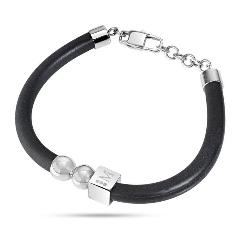 Pulsera caballero SYY04 con banda de goma negra y detalles en acero inoxidable plateado. Incluye cierre mosquetón y esferas decorativas, con un elegante detalle grabado con la letra 'M'. Ideal para hombres que buscan un accesorio moderno, resistente y con estilo urbano. Perfecta para uso diario o como regalo sofisticado.