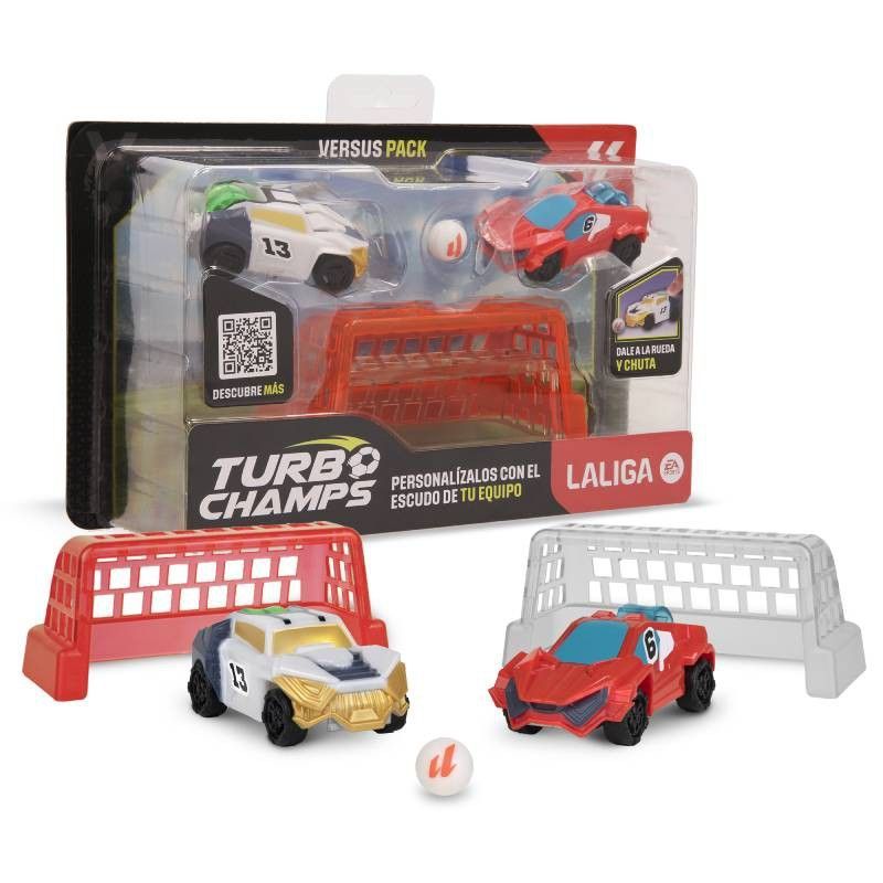 Juego Turbo Champs LaLiga Versus Pack con dos coches de carreras de plástico, barreras y pelota. Ideal para niños amantes del fútbol y las carreras. Personaliza los coches con el escudo de tu equipo favorito. Incluye accesorios para recrear emocionantes competiciones. Perfecto para desarrollar la imaginación y el juego simbólico.