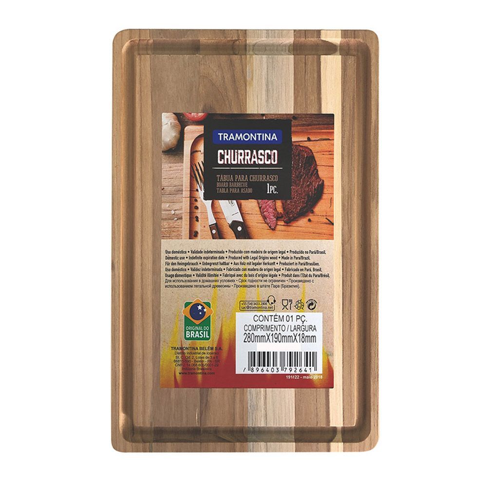 Tabla de corte rectangular Tramontina para churrasco, fabricada en madera de acabado natural. Ideal para cortar carne y preparar alimentos en la parrilla. Con dimensiones de 280x190x18 mm, ofrece resistencia y durabilidad. Perfecta para uso en cocina y barbacoas al aire libre. Incluye etiqueta con información del producto y origen brasileño.