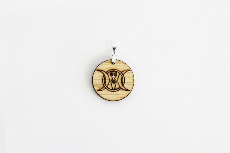 Talismán celta Triple Diosa en madera natural con acabado grabado, ideal para amantes de la simbología celta y la espiritualidad. Colgante circular con cadena metálica plateada, perfecto como joya de protección y conexión con la energía femenina. Diseño detallado y auténtico, ideal para adultos que buscan piezas únicas y con significado.
