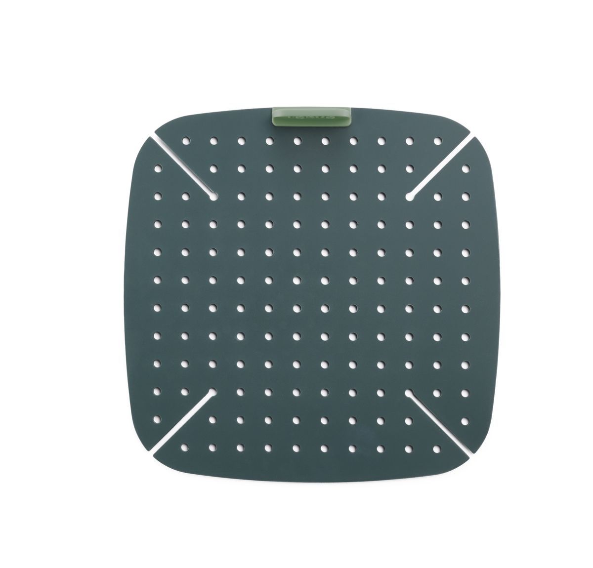 Tapete para freidora de aire Lekue en silicona de color gris oscuro, con diseño perforado para una mejor circulación del aire. Ideal para cocinar alimentos más saludables y sin grasas. Incluye detalles blancos en las esquinas y una pestaña verde para facilitar su manejo. Resistente al calor y fácil de limpiar. Perfecto para uso diario en tu cocina.