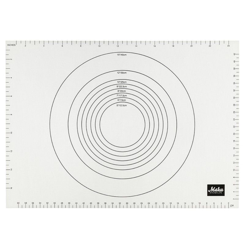 Tapete para hornear Maku de color blanco, fabricado en plástico resistente. Ideal para pasteleros y amantes de la cocina, cuenta con marcas de medición en pulgadas y centímetros, así como círculos concéntricos para cortar y moldear con precisión. Perfecto para hornear, decorar pasteles y preparar tartas con exactitud. Incluye logotipo de la marca e
