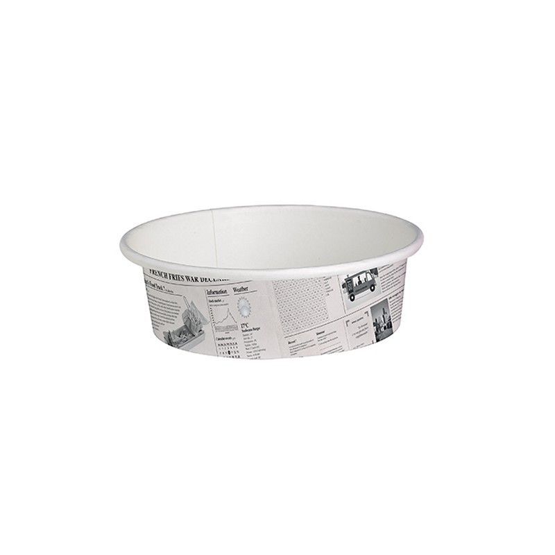Tarrinas de cartón con diseño 'News' de 360 ml, ideales para servir postres, helados o alimentos en eventos, cafeterías y restaurantes. Diseño elegante con estampado de periódico en tonos blanco y gris. Pack de 500 unidades, solución práctica y desechable para uso profesional o hogareño. Fáciles de usar y con acabado resistente.