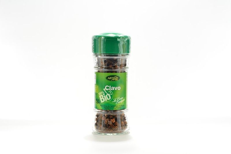 Tarro de clavo de olor ecológico de 30 gramos, ideal para cocinar platos aromáticos y especiados. Presentado en un frasco de vidrio transparente con tapa verde y etiqueta con diseño de hoja verde. Perfecto para amantes de la cocina natural y sostenible. Contenido visible: clavos enteros de alta calidad.