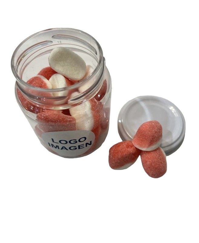 Tarro de golosinas besos rosas, ideales como detalle dulce o regalo. Presentadas en un frasco de vidrio transparente con tapa de plástico, estas deliciosas golosinas en forma de beso combinan tonos rosa y blanco con una textura granulada y cubierta de azúcar fina. Perfectas para compartir en eventos, fiestas o como aperitivo dulce. Incluye etiqueta
