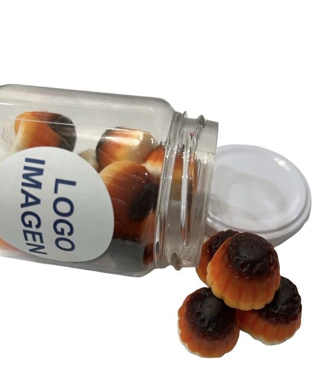 Tarro de golosinas en forma de flanes, ideales como aperitivo o regalo. Presentadas en un elegante tarro de vidrio con tapa blanca, estas deliciosas golosinas de frutas combinan un exterior dorado con un centro oscuro, ofreciendo un sabor dulce y tentador. Perfectas para compartir en reuniones, eventos o como detalle personalizado. Incluye etiqueta