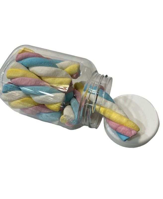Tarro de golosinas Nubes Twist con deliciosas nubes de colores pastel en forma de trenza. Perfecto para disfrutar como aperitivo dulce o regalo original. Contenido visible en tarro de vidrio transparente con tapa blanca. Ideal para compartir en reuniones, fiestas o como detalle dulce.