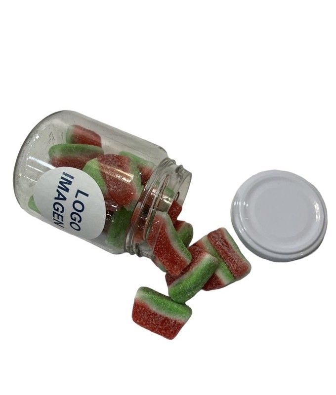 Tarro de golosinas en forma de tajada de sandía, con capas de color rojo, verde y blanco y textura granulada por azúcar. Ideal para disfrutar como aperitivo o regalo. Presentado en un elegante frasco de vidrio con tapa blanca, perfecto para compartir o como detalle dulce en eventos.