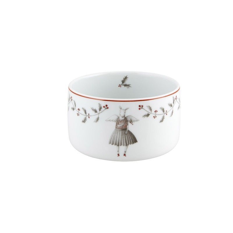 Taza de porcelana Nöel con diseño navideño en blanco, rojo y negro. Ideal para disfrutar café o té con estilo festivo. Decorada con una figura de conejo vestido, ramas con bayas y un elegante borde rojo. Perfecta para regalar o usar en temporada navideña.