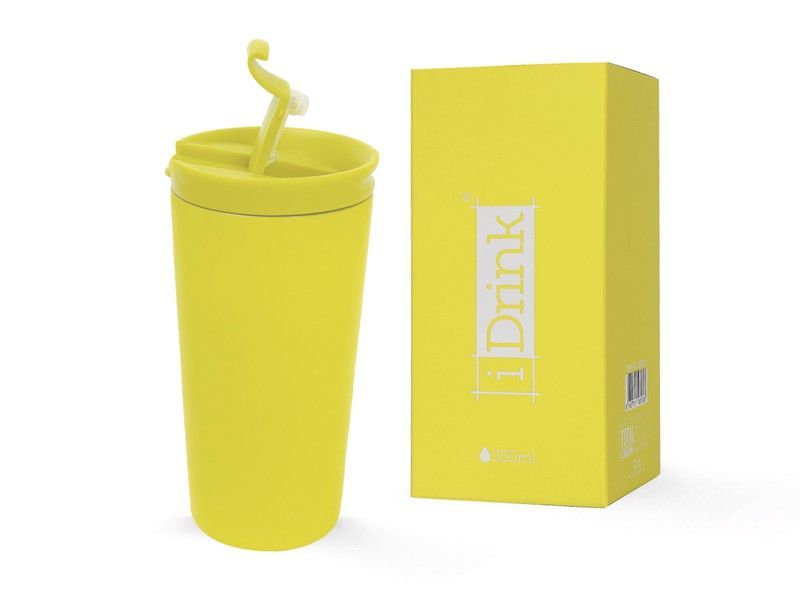 Taza de viaje de 350 ml en color amarillo, fabricada en plástico resistente y con tapa y paja incorporadas. Ideal para llevar bebidas frías o calientes en el día a día, perfecta para el trabajo, el gimnasio o los viajes. Diseño práctico y moderno, fácil de limpiar y transportar. Incluye caja de cartón amarilla con marca iDrink.
