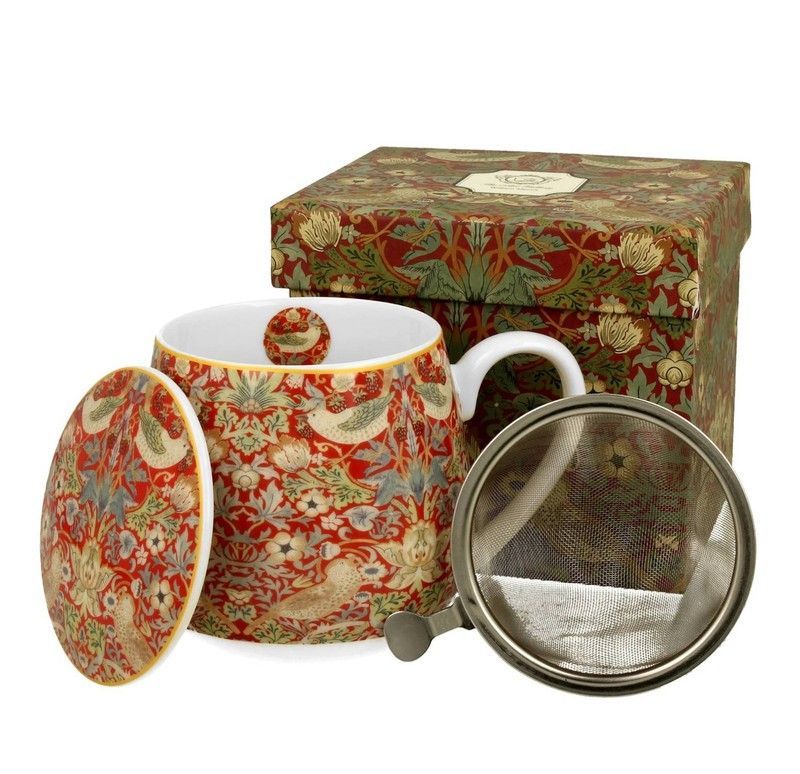 Taza infusor Morris Rojo en porcelana, ideal para amantes del té y infusiones. Diseño floral clásico en tonos rojos y verdes, con infusor de acero inoxidable para una preparación perfecta. Incluye tapa decorativa y viene en elegante caja con diseño de hoja verde. Perfecta para regalar o disfrutar en casa.