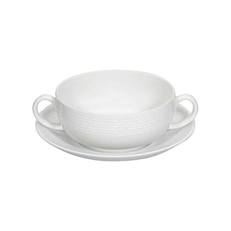 Taza para consomé de porcelana blanca con plato, ideal para servir sopas y cremas con elegancia. Diseño texturizado que imita tejido, asas laterales para mayor comodidad y acabado pulido. Perfecta para uso diario o ocasiones especiales en tu mesa. Medidas: 16,7 x 16,7 x 5,4 cm.