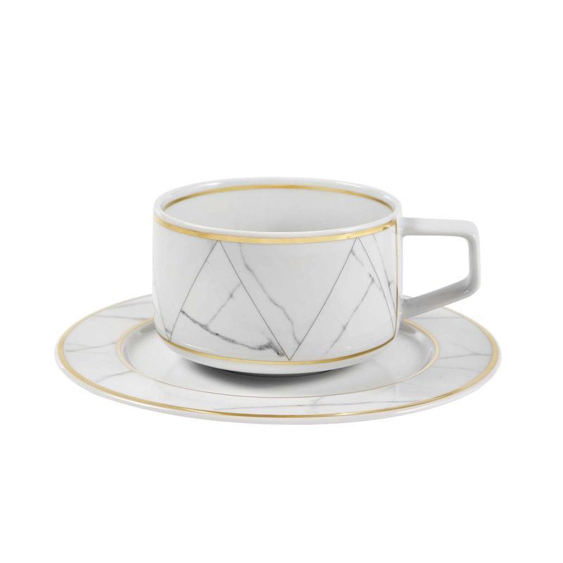 Taza de té con platillo en porcelana de diseño elegante con acabado mármol Carrara y detalles dorados. Ideal para amantes del té y el café, aporta un toque sofisticado a tu mesa. Perfecta para uso diario o como regalo especial. Calidad duradera y diseño atemporal.